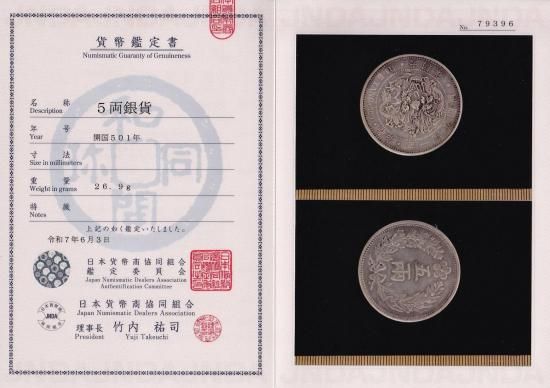 明治7年 旧5円金貨 未使用 鑑定書付 送料込