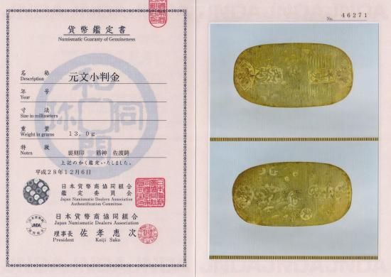 元文小判金 筋・神(佐渡鋳) 鑑定書付