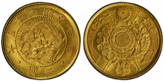 明治3年 旧2円金貨 希少タイプ・切りウロコ/多点旗 MS66/完全未使用 送料込