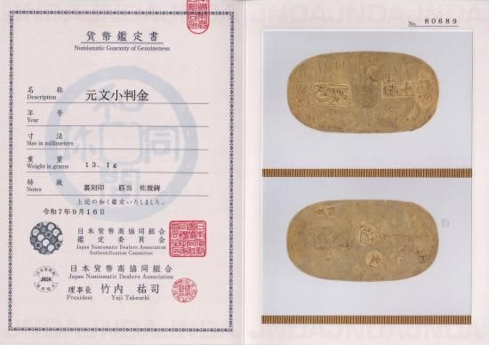 元文小判金 筋・当(佐渡鋳) 美品 鑑定書付 送料込