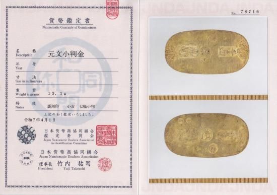 元文小判金 七福小吉 美品 鑑定書付 送料込