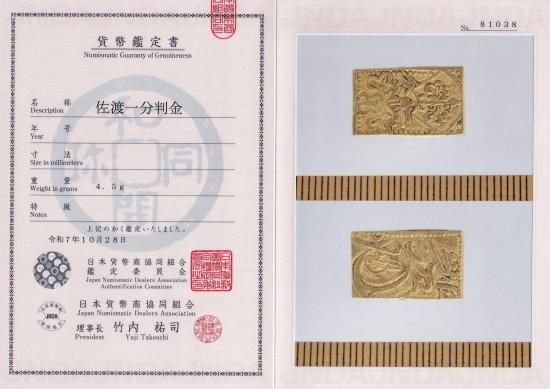 佐渡一分金 無刻印 片面額縁 美品 鑑定書付 送料込