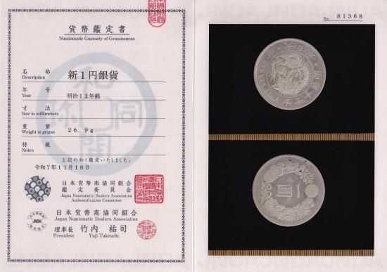 明治12年 新1円銀貨 極美品 鑑定書付 送料込